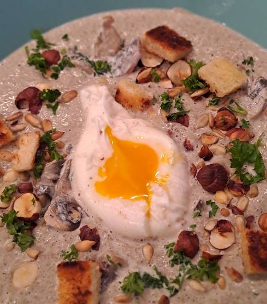 En entrée, nous réaliserons une délicieuse crème de champignons toute en douceur, servie avec des croûtons dorés, graines de tournesol et noisettes torréfiées.