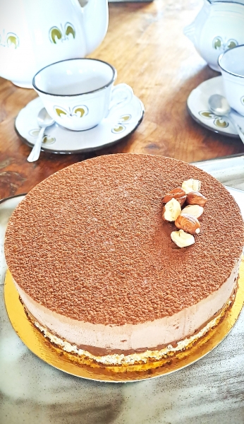 Un biscuit dacquoise noisette, recouvert d'une couche de croustillant chocolat praliné et d'une mousse légère au chocolat!